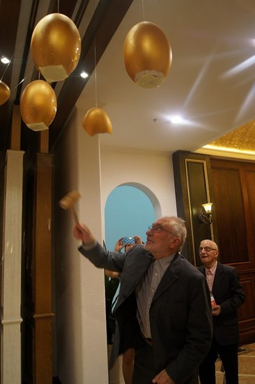 門迪尼兩兄弟首先在生活家領(lǐng)導(dǎo)一行的陪同下參觀了生活家地板在重慶居然之家金源店的重慶旗艦店。嶄新的展廳陳設(shè),優(yōu)質(zhì)的木質(zhì)呈現(xiàn)獲得了門迪尼兩兄弟的稱贊。而展廳一角掛在屋頂上的金蛋也引起了門迪尼兄弟的關(guān)注,在翻譯的解釋下,亞歷山德羅·門迪尼的同胞兄弟弗朗西斯科·門迪尼也拿起了木棍,砸下了一個(gè)金蛋,為新店開張送出了自己的祝福,給現(xiàn)場帶來了活躍的氣氛。