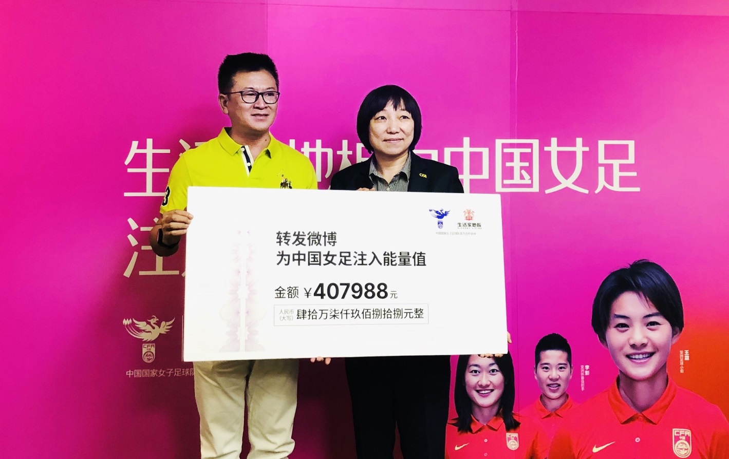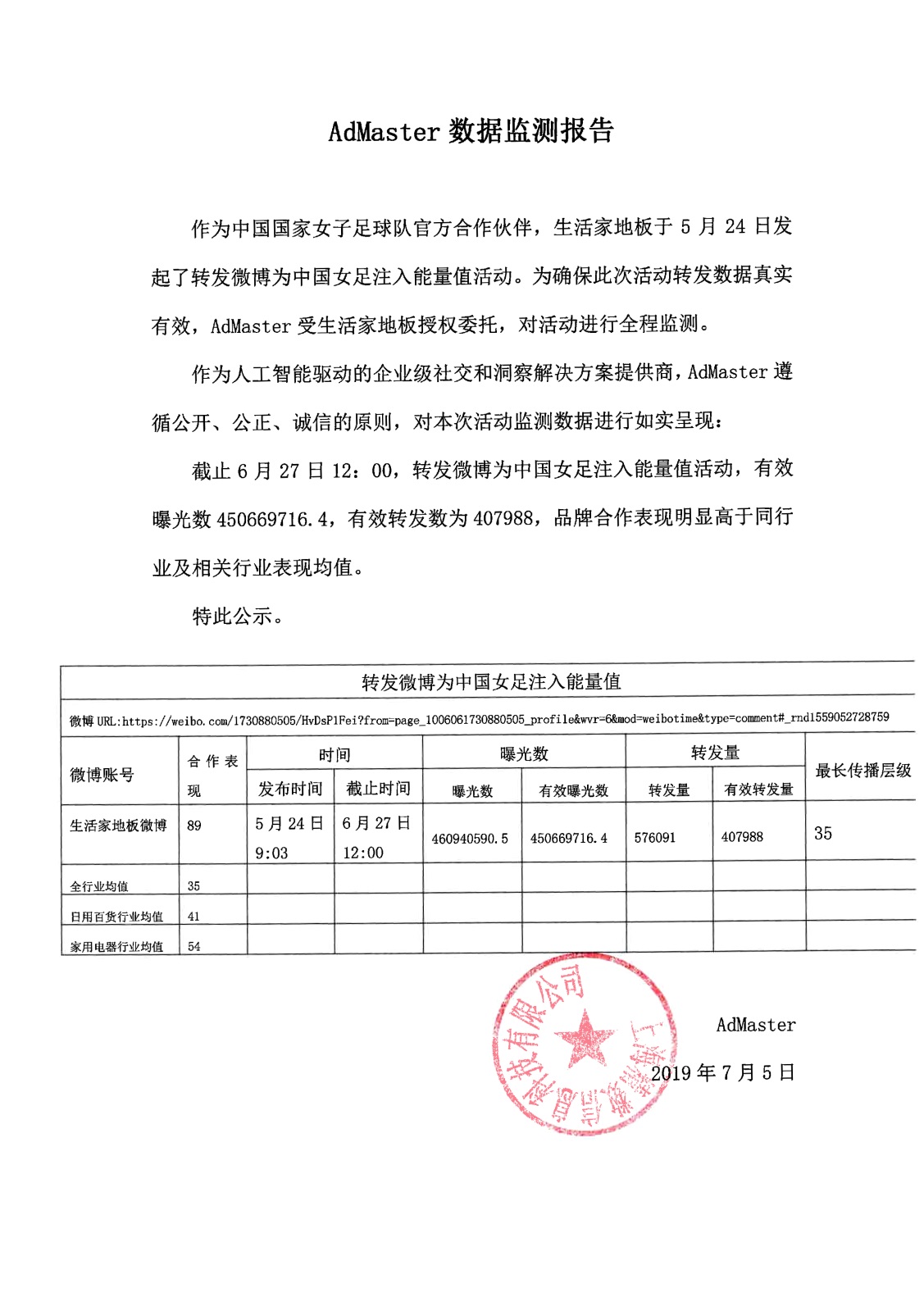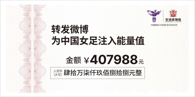 經(jīng)權(quán)威數(shù)據(jù)公司AdMaster鑒定,截止 6 月 27 日 12 : 00,生活家助力中國女足轉(zhuǎn)發(fā)活動有效曝光數(shù)為450669716次,有效轉(zhuǎn)發(fā)數(shù)為407988次,按照轉(zhuǎn)發(fā)規(guī)則,生活家地板正式為中國女足兌現(xiàn)407988元能量基金。