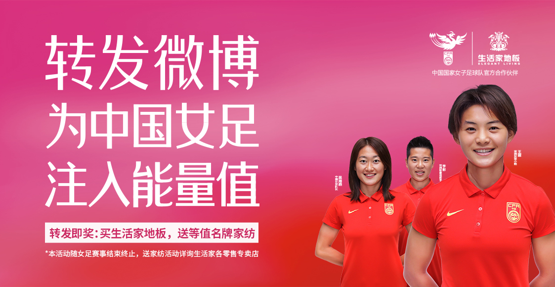 為呼吁全民關(guān)注女足,助力中國女足發(fā)展,今年法國女足世界杯期間,生活家地板在新浪微博發(fā)起了#轉(zhuǎn)發(fā)微博為中國女足注入能量值#的線上線下聲援行動,旨在呼吁更多人關(guān)注中國女足賽事,展示中國女足努力拼搏、頑強(qiáng)不息的風(fēng)采。