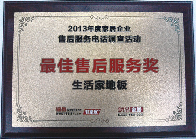 2013年3月13日,網(wǎng)易家居發(fā)布第三屆“家居企業(yè)售后服務(wù)電話調(diào)查”數(shù)據(jù)報(bào)告暨“企業(yè)售后服務(wù)調(diào)查總評榜”,生活家地板榜上有名,并榮獲“最佳售后服務(wù)獎(jiǎng)”,這也是自活動(dòng)連續(xù)三年舉辦以來的生活家第三次獲獎(jiǎng)。