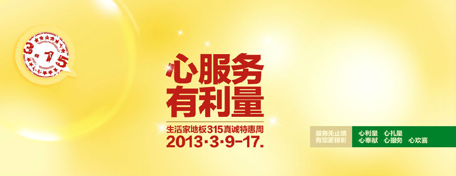 生活家地板,始終堅持和貫徹多年以來一直為消費者提供的金鑰匙服務(wù),2013年的315期間,更特別推出“心服務(wù),有利量”活動,既為消費者提供生活家的優(yōu)質(zhì)產(chǎn)品,更藉此時機全面升級生活家服務(wù)內(nèi)涵。除了為購買生活家地板的消費者服務(wù),還將服務(wù)范圍擴大到所有缺少售后服務(wù)的其他地板用戶,您只要前往生活家門店進行登記,就可獲得免費檢修和保養(yǎng)?;顒悠陂g每天更推出環(huán)保禮包和5位輔料全贈送名額,生活家地板,誠信+服務(wù),禮利雙貼心!