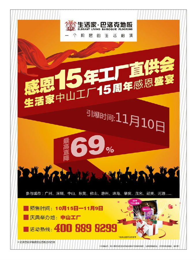 為了回饋廣大支持和親睞生活家地板的廣東客戶,華南分公司將于11月10日在中山工廠舉辦盛大的工廠直供促銷活動。