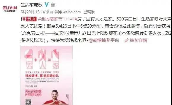 今年生活家地板借助520網(wǎng)絡(luò)情人節(jié)自帶流量的優(yōu)勢,在微博發(fā)起“全民戀家節(jié)1+1=1”的活動,聯(lián)合艾克森與王霜掀起一場“戀家表白禮”活動,進一步深化合作內(nèi)涵。并借勢在微博掀起繼“轉(zhuǎn)發(fā)微博給中國女足發(fā)獎金”之后的又一波轉(zhuǎn)發(fā)熱潮——轉(zhuǎn)發(fā)微博抽取一位網(wǎng)友送出無限量玫瑰,向家人表達愛。