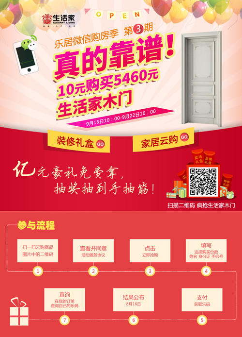 為了緊跟移動互聯(lián)的時代潮流,拉近與消費者之間的距離,生活家特攜手新浪樂居開展微信裝修節(jié)活動。9月15日(周一)上午10點, "10元搶生活家木門"微信云購正火熱進行中。