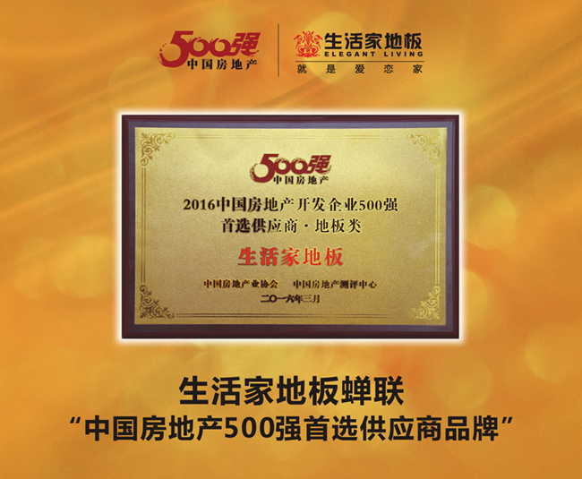 近日,由中國房地產(chǎn)業(yè)協(xié)會、中國房地產(chǎn)測評中心聯(lián)合主辦的“2016中國房地產(chǎn)500強及500強首選供應商、服務商品牌”測評成果發(fā)布會暨500強峰會在北京隆重舉行。生活家憑借品牌影響力、產(chǎn)品品質(zhì)、產(chǎn)品售后服務等多方面的優(yōu)秀表現(xiàn),摘下了“2016中國房地產(chǎn)開發(fā)企業(yè)500強首選供應商·地板類”榮譽稱號。