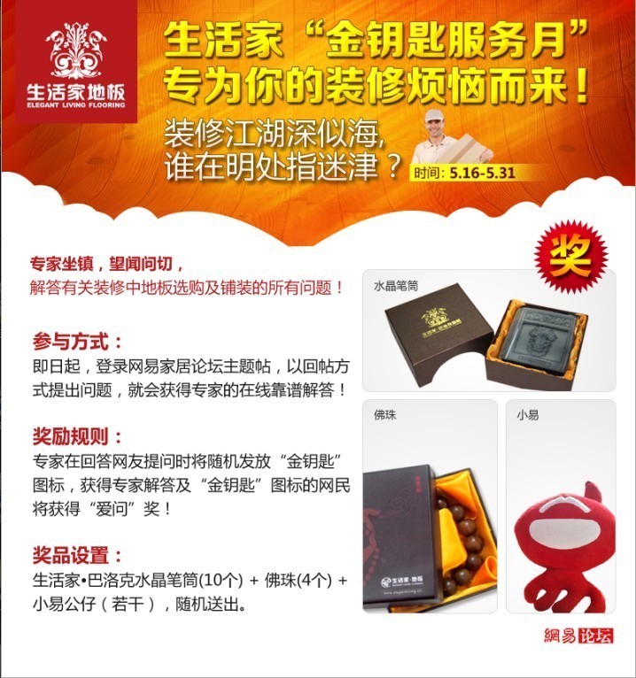 裝修江湖深似海,誰在明處指迷津?生活家地板金鑰匙服務(wù)月,專為你的裝修煩惱而來——即日起,登錄網(wǎng)易家居論壇,提出你的家庭裝修中的地板鋪裝煩惱問題,就會獲得生活家地板專家的在線靠譜解答,同時有精美禮品免費奉送。