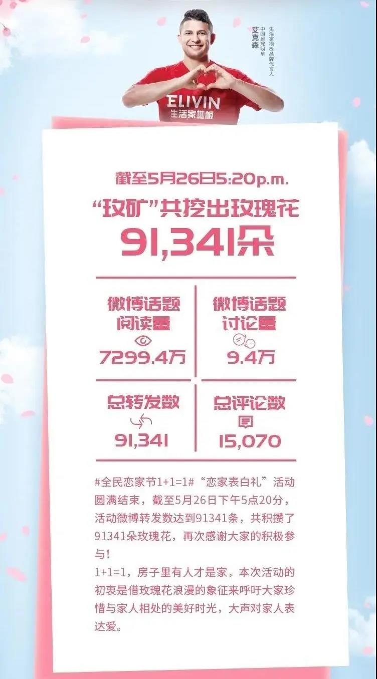 5月20日,生活家借助520網(wǎng)絡(luò)情人節(jié)自帶流量的優(yōu)勢,在微博發(fā)起“全民戀家節(jié)1+1=1”的活動,中國足球隊知名球星艾克森與王霜呼吁大家在向另一半表達愛的同時,不要忘記向家人表達愛意與感謝。生活家在官方微博掀起了一場“戀家表白禮”活動:轉(zhuǎn)發(fā)指定微博,就有機會獲得 “戀家表白禮”——抽取1位幸運兒送出玫瑰花,活動微博轉(zhuǎn)發(fā)多少次,就送多少枝玫瑰!在眾多大V和粉絲的轉(zhuǎn)發(fā)下,本次微博互動話題閱讀量高達7299.4萬,話題討論量達9.4萬,總轉(zhuǎn)發(fā)數(shù)91341。