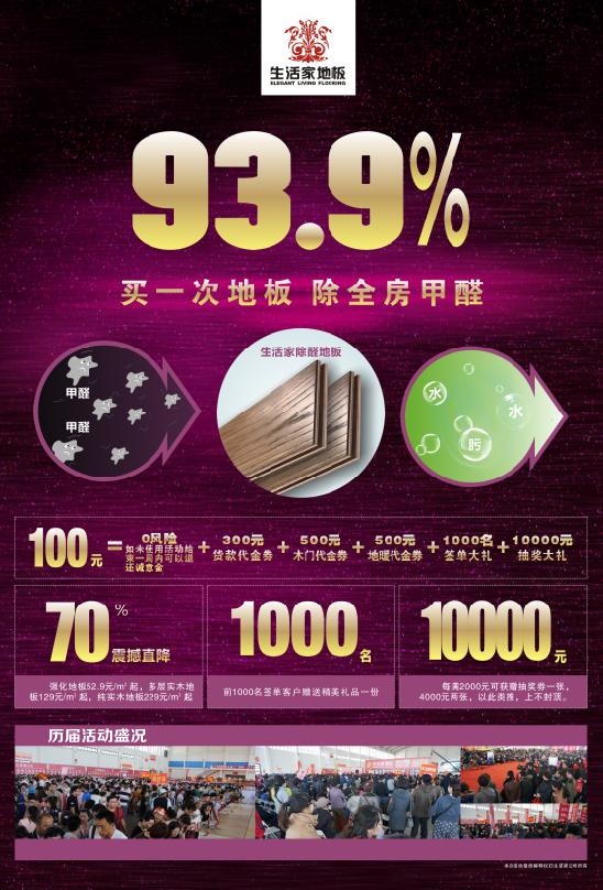 為喜迎生活家除醛地板的隆重上市,生活家地板在全國范圍內(nèi)展開了主題為“至臻新品除醛風(fēng)暴”的大型促銷活動。只需6月21日前,在生活家地板湖北省各門店花100元誠意金購買一份VIP手冊,參加6.21團(tuán)購活動,現(xiàn)場消費(fèi)地板滿2000元即可享受100抵1498的超級優(yōu)惠。而且購卡0風(fēng)險(xiǎn),如果您的VIP手冊未使用,活動結(jié)束后1周內(nèi)還可退還100元。6月21日當(dāng)天,全場地板廠價(jià)直供,部分產(chǎn)品3折放送,部分強(qiáng)化地板52.9元/㎡起,實(shí)木多層地板129元/㎡起,仿古實(shí)木地板229元/㎡起。前1000名簽單顧客贈送精美禮品一份,送完即止,搶到即是賺到!此外,6月21日活動現(xiàn)場只要繳納全款,就可享受5%廠家返現(xiàn)?,F(xiàn)場交款每滿2000元可獲贈抽獎券一張,更有機(jī)會抽中美的凡帝羅對開門冰箱、生活家品牌精品廚具及生活家高檔環(huán)保自行車等哦!