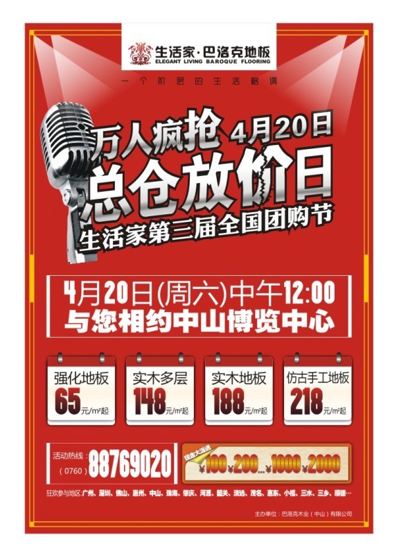 為切實(shí)解決消費(fèi)者在地板選購過程中面臨的問題,不再疑惑迷茫,讓消費(fèi)者“少花錢”、“買好地板”,明白消費(fèi),生活家地板從4月份開始,集合品牌力量,匯聚銷售渠道,將在4月20日舉辦“總倉放價(jià)日” 暨生活家地板第三屆全國團(tuán)購節(jié)大型團(tuán)購活動,地點(diǎn)就在中山博覽中心。